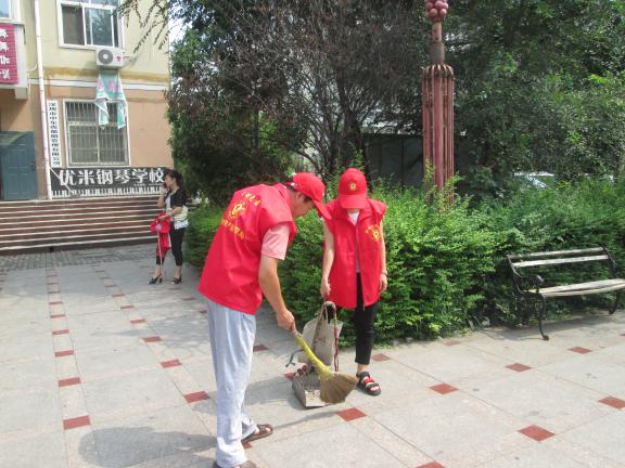 分局党员志愿者首先在吉祥社区进行了环境卫生服务活动,即使烈日炎炎,每个人都流下了汗水,但是大家仍然积极行动,认真打扫,不放过角角落落。