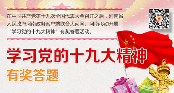1018-24日,中国共产党第十九次全国代表大会在北京召开。为了帮助广大网友强化对党的十九大精神的学习和理解,河南省人民政府河南政务客户端联合大河网、河南移动开展的“学习党的十九大精神”有奖答题活动1025日正式启动,欢迎广大网友下载河南政务客户端,参与有奖答题。