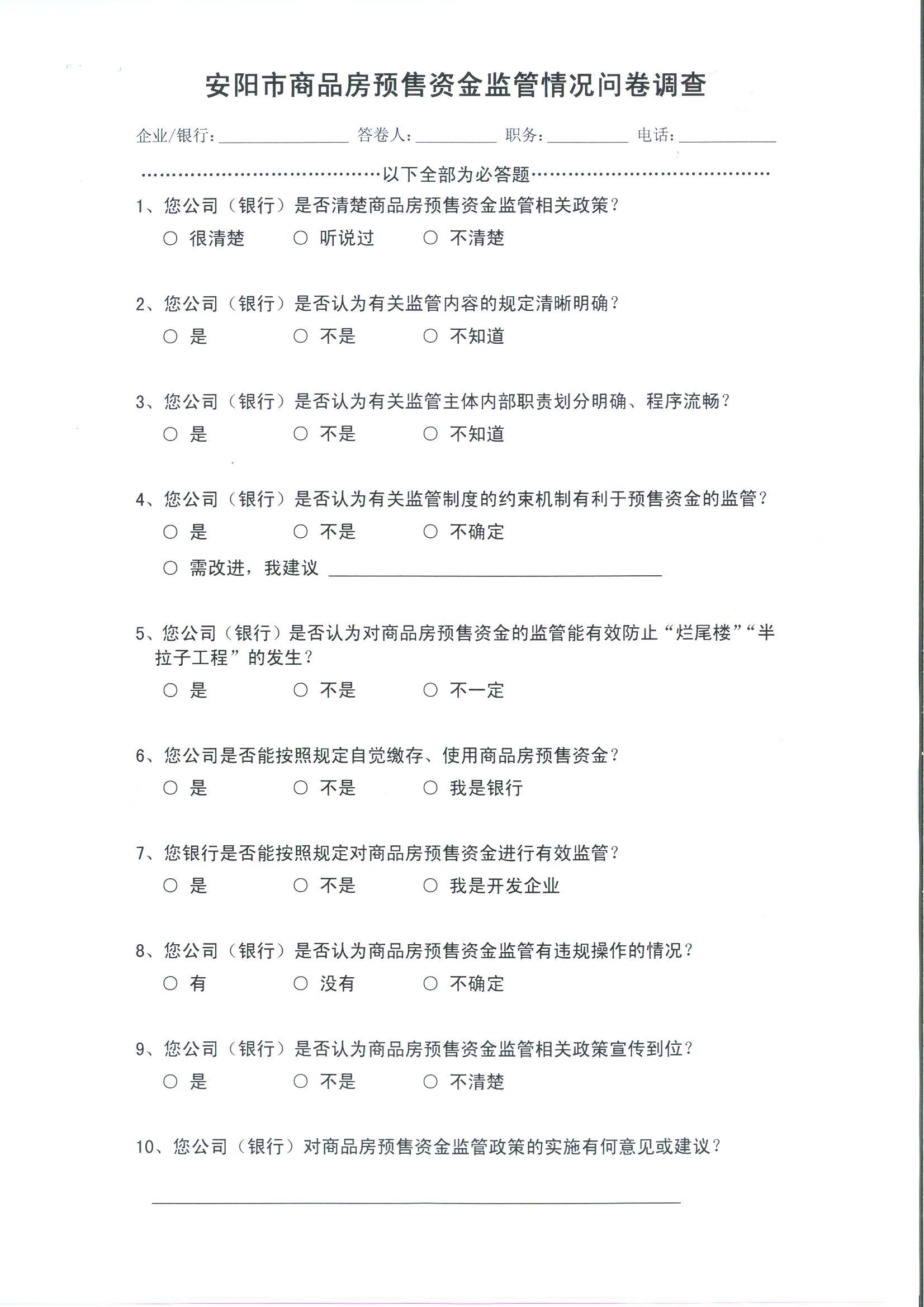 安阳市商品房预售资金监管情况问卷调查(下载)