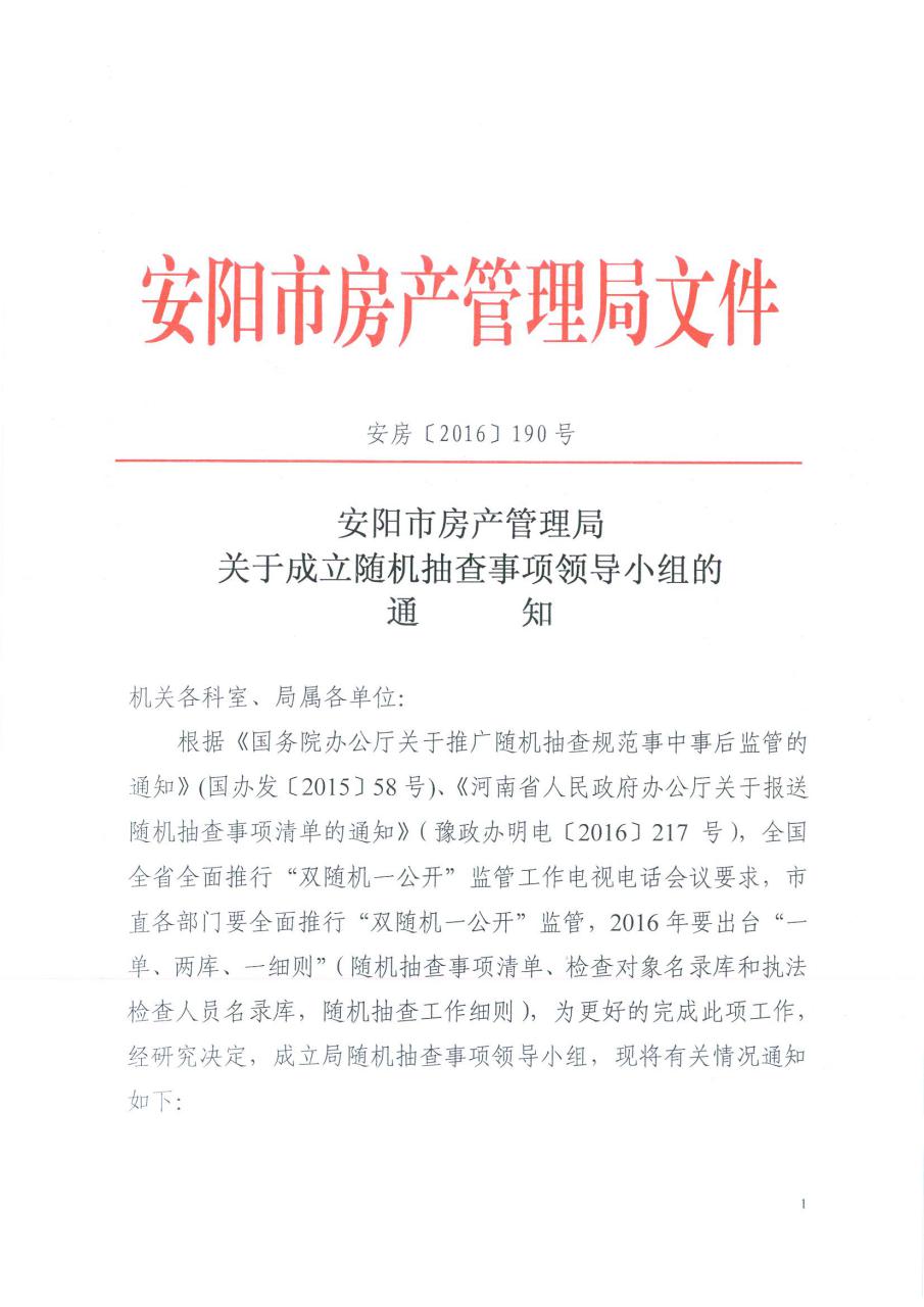 安房〔2016〕190号安阳市房管局关于成立随机抽查事项领导小组通知